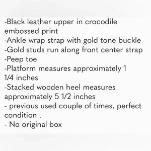 Peep toe and 1.25" platform. 5.5" wooden block heels. Very stable for the height.