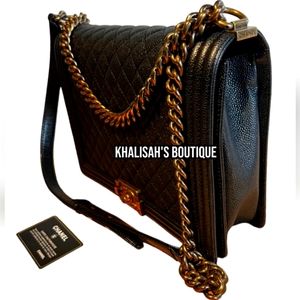 RARE NEW CHANEL BOY JUMBO Large Flap XL Black CAVIAR Leather Antique Gold Quilted