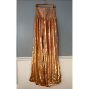 Stand out in this so special one piece jumpsuit featured in a shiny, metallic fabrication and bandeau, wide-leg silhouette for a timeless look no matter the occasion.