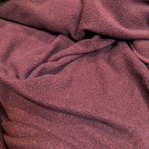 Faux wrap pullover hooded sweater from Athleta in maroon. Features a cowl neck, ribbed knit sleeves, and pockets. Size tag has been removed, measurements are below. One small hole and some pilling - see photos for details. Hang tag is still attached.