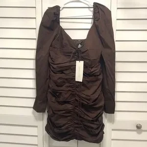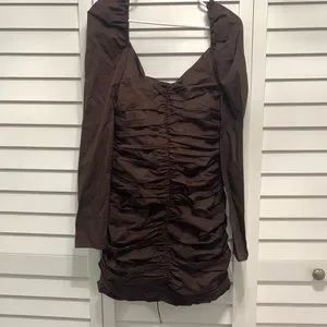 Zara Dress long sleeves. New with tag. In style piece. Blogger favorite. Mini. Puffy sleeves with ruched. Perfect dress for a night out. Hot, trending brown color! Size Large.