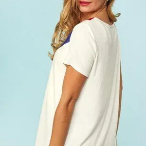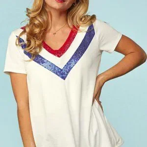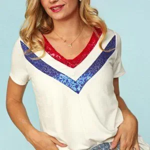 This top will take you through all the summer festivities! It features a v-neck outlined in red and blue sequins in a colorblock pattern. This is set on an ivory background. The top boasts short sleeves and a comfortable fit. Rock this one at all of your upcoming BBQs!