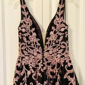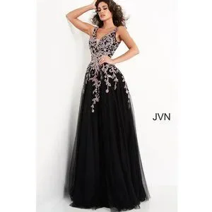 Jovani JVN 2302 Size 6 Black/Rose Floral V Neck A Line Ballgown Prom Dress Formal
