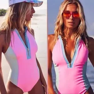 COLOR-BLOCKED MOCK NECK ONE PIECE WITH FRONT ZIP ENTRY
