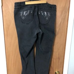 One pair of faded black jeans featuring sequins on back pockets & 5th pocket.