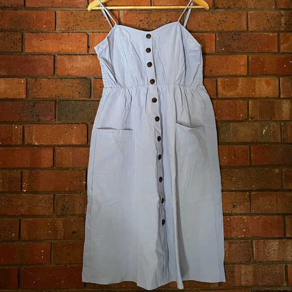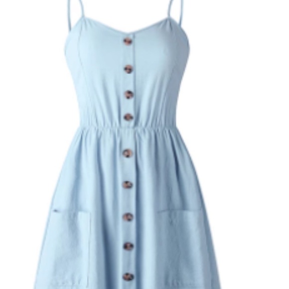 NWOT Cotton blue dress. Dress has two pockets at the front. Buttons down the front. Never worn. Summer style! New without tags.