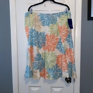 Floral rayon/linen blend skirt. Total length is 26". Has size hook/zipper closure. Overall cream color with pastel blue/pink/green/tan flowers.