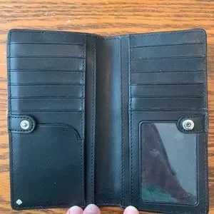Authentic Kate Spade bifold wallet with snap closure. 13 card slots including clear slot for ID. 2 additional inside pockets on either side. Zipper pocket on the back. Cream and black color. Kate Spade name plate in gold. Barely used, great condition.
