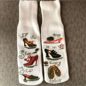 Really cute socks for any shoe lover you might know. One sock reads: “if the shoe fits,” and the other sock says: “buy it in every color!” They are anklet length. Would make a great gift for a friend or maybe yourself?! New and never worn.