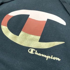 NWT. Champion women’s size 1X hoodie. This one is sooo beautiful! Black hoodie with an, oh so feminine Champion logo on front. Pull over style with front pockets, (no zipper). Soft fleece interior, drawstring hood. Logo has matte light salmon and brick colors with metallic gold. Gold is a true gold color. Pics are a little deceiving. Prettier in person. Colors are perfect for someone who loves rose gold. Stored in smoke-free home.