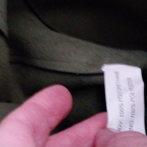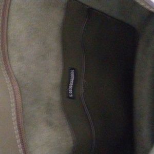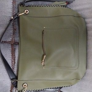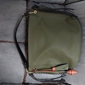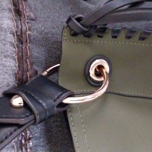 dark olive with black detailing. short shoulder strap. fringe and leather wrap hanging detail. 3 interior pockets one back zip pocket. plastic still on hardware zipper pulls. new without tags. plenty of room on the inside. Great statement piece