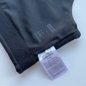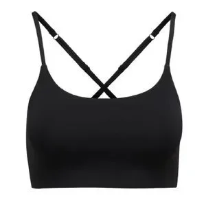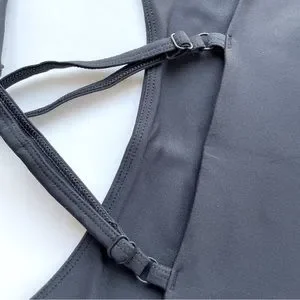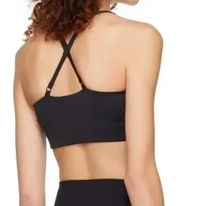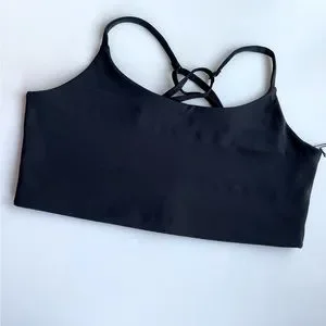 Pullover bralette with adjustable length, crossed straps. It’s the ‘Float Juliet Bra’ in black. Light to medium support in sweat wicking recycled polyester. It’s fully lined, with soft elastic hem. Marked as 2XL and NWT.
