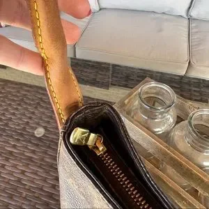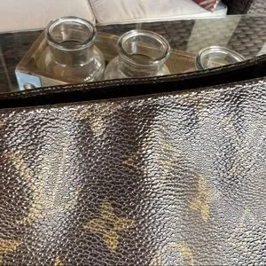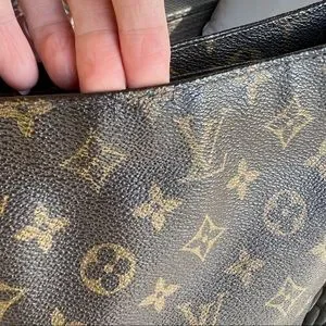 The Looping GM is an unique bag as you can remove the handle easily and add a different handle for a whole different look without permanently altering the bag! See videos on this. The only Vachetta leather on the bag is the handle. The handle here is in good condition but it is darkened and one side isn’t as stiff as the other. It will last a lot longer if this is the look you wish to keep. Pics 4 & 5 depict the small ‘cracks’ in the canvas along the top of the bag (a common problem). They are very small here. There are no other defects in the monogram canvas. All other corners and edges are pristine!