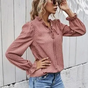 Perfect for the night out or for back to the office, this loose fitting, high neck blouse is sure to make the best statement. It has a tie at the neck that makes a cute bow, or leave it as strings. White dotted pattern on a dusty rose color fabric. Gently loved, but ready for something new.