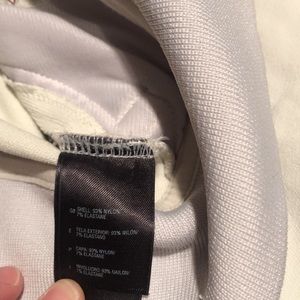Like new. Light cream/ivory colored with sky blue piping/accents and embroidered TNF interior pocket. Attached good. No stains. Slight stretch to shell fabric for flattering comfort fit and movement. No wear on cuffs or waist. Excellent condition!