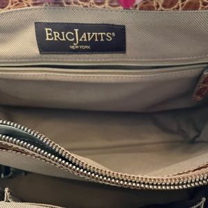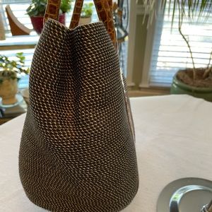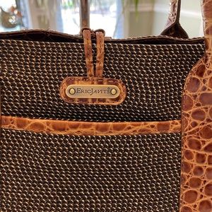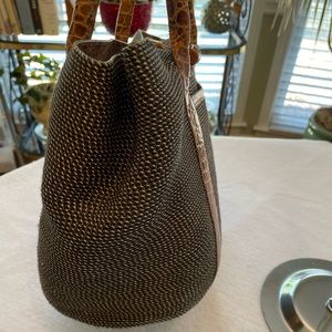 Sophisticated summer bag from designer Eric Javits. Squishee bag with beautiful crocodile accents. This bag is clean and aside from a missing zipper pull (which seems to be common in the model) is in excellent condition. Measures 14”x9”x7” with a 9” drop of the handles.