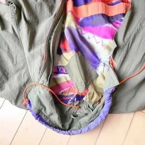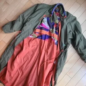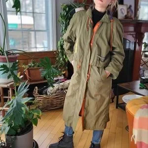 Olive green with bright orange accents. This vintage coat is a cool addition to your spring wardrobe.