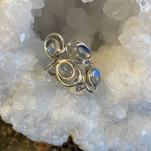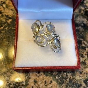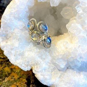 Sterling Silver Genuine Rainbow Moonstone Ring Size 10. Retail 156.00 NWT. Spectacular! Mostly Blues Running Thru These 4 Bezel Set Oval Genuine Rainbow moonstones. Stamped 925. Just Gorgeous! The swirls of sterling really accent these beautiful stones! Gift boxed. Size 10. Retail 198.00 NWT
