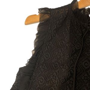 100% Silk semi-sheer jacquard fabrication. Threaded tie at the neck. Ruffled neck line and sleeve detail.