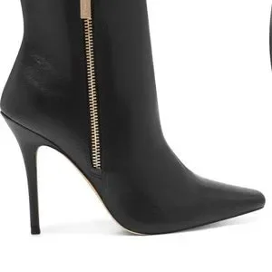A tapered snip toe adds modern style to an exposed zip bootie that is finished with a daring stiletto heel.