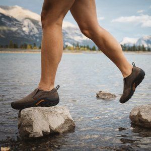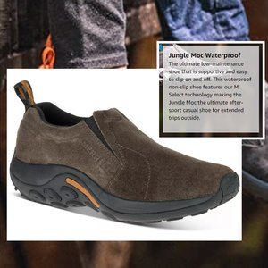 Trek through any nature with the Jungle Moc Waterproof hiking shoe from Merrell®. Waterproof pigskin with dual goring sides for easy slip on. Pull tab on back for easy on and off. M-Select FRESH naturally prevents odor before it starts for fresh smelling feet. Molded nylon arch shank. Compression molded EVA footframe with air cushion in the heel absorbs shock and adds stability. M-Select GRIP tunes each outsole with durable traction that grips when and where you need it.