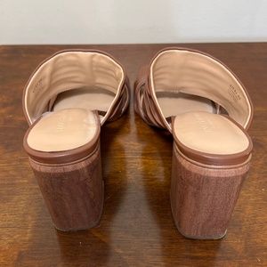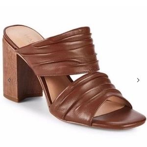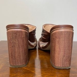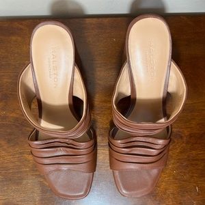 Halston Heritage Kiera brown leather slide on heeled mule style double strap sandals size 8M. Run true to size. Leather uppers. PVC heels. Rubber soles. In very good preowned condition, normal wear on soles. Heel height is approximately 3.5”. Lightly cushioned footbed. Smoke free home. Same day or next business day shipping.