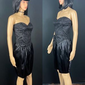 Strapless sequined corset dress giving glam chic with a side of late 80s camp. Garment features a basque waistline and a black satin flower fastened to the left hip. Boning present on the torso and zipper down the back. This item has been gently worn, washed and does not have tags.