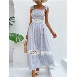 White Crochet Trim Striped Blue Maxi Dress Tie Straps Square Neck Flowy Flared