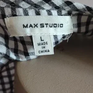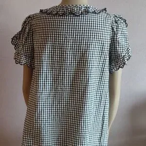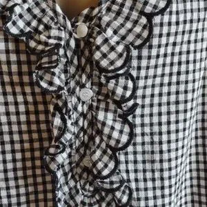Black and white gingham pullover top with ruffled vee neckline. Split short sleeves with ruffle trim. Crisp cotton fabric for a classic summer look. EUC, worn once.