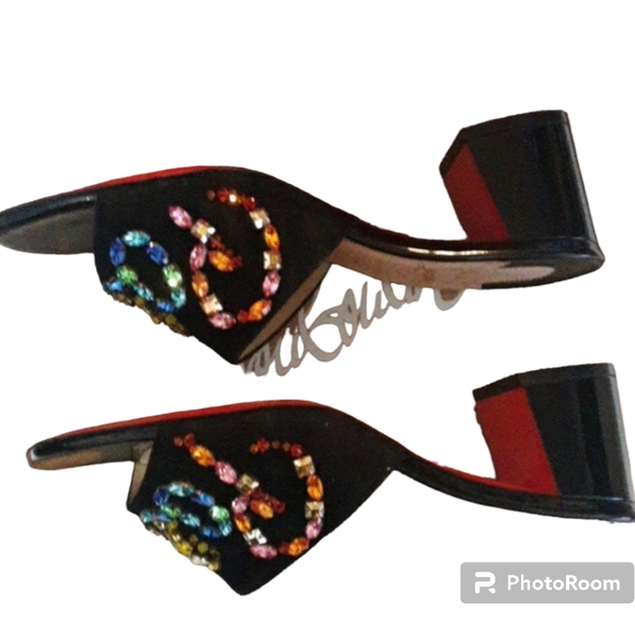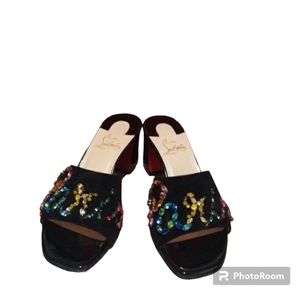 Christian Louboutin "Dear Paris" sandal in calf suede with multi colored crystal -studded logo. is missing 1 gem see all photos you cant tell without looking closely these has only been worn a few times still like new and very beautiful not an easy pair to find. has original box and 3 dust bags