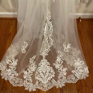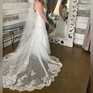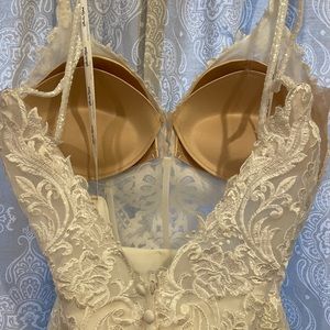 Bridal size 12 (fits like street size 6-8). In color ivory lace and tulle over ivory with porcelain tulle plunge.