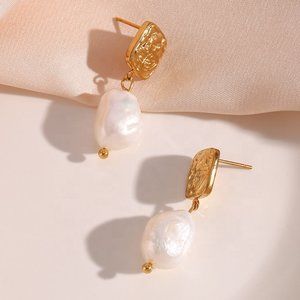 Vintage Square Hammered Texture Fresh Water Pearl 18K Gold Plated Earrings