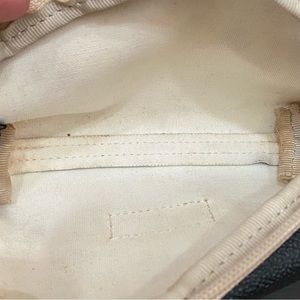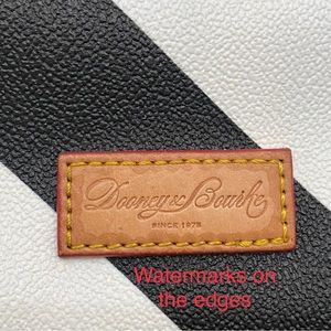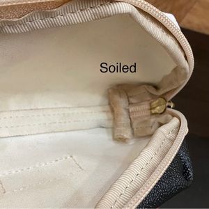 Dooney & Bourke Black and White Diagonal Stripe Small Cosmetic Pouch. Pre-owned with normal wear from use. Inside is SOILED with stains from make-up. There is a faint smell maybe from the beauty products. Edges of the leather plate has water marks. See photos for details and measurements. You will get exactly as pictured.