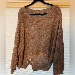 Very cool express sweater. Very slouchy and loose with a cool open back detail. Size large but fits like a 1X. Sleeves are baggy and there is some looseness at the cuffs from wearing with sleeves pushed up (see picture).