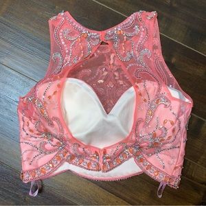 A stunning two piece ball gown that features a fully beaded scalloped bodice, matching beaded waist, and a full box pleated tulle skirt. Back zipper closure.