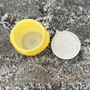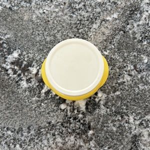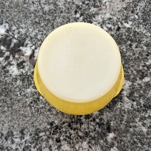 Vintage Glasbake honey pot with original plastic lid. This listing is for a yellow pot, and there is a melon color available as well.