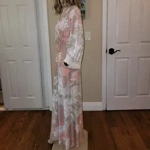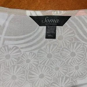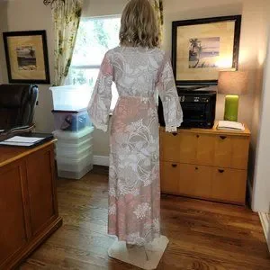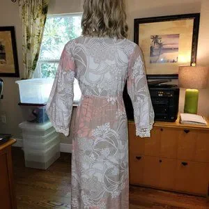 Soma Intimates empire waist long maxi dress in size S Small. Drawstring waist. Wide 3/4 sleeves with lace at cuffs. Lace insert at bust. Pretty peach, tan & ivory print all over. Made of soft poly/spandex knit. Excellent condition - like new.
