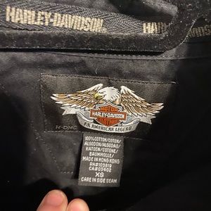 This shirt has buttons on the front of it and it has a Harley Davidson patch on the shirt and a really cool engraved logo on the back