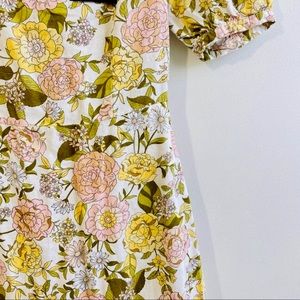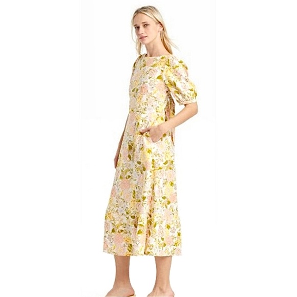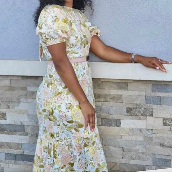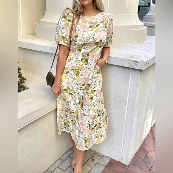 Last One Linen Floral Print Tie Back Midi Dress With Puff Sleeves & Side Pockets