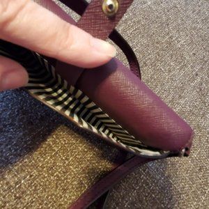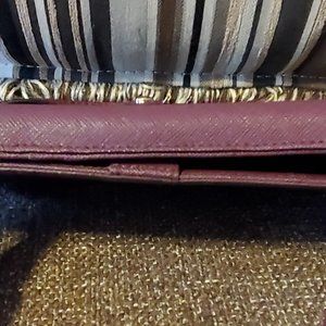 This Kate Space is a cutie. She is a deep burgundy Saffiano Leather and features a long strap, 5 card slots and an ID window. Her snap works perfectly and she doesn't have a flaw on her. Please look at all pics.
