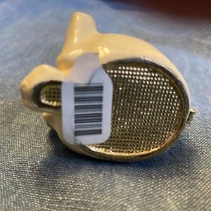 Vintage enameled rabbit ring holder, with rhinstones in its ears. Closes with a small magnet. There's a small nick in the enamel on the side of the back leg (see photo). Stands 3 inches tall.