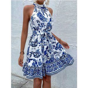 Blue And White Boho Womens Floral Print Belted Halter Dress