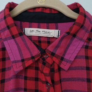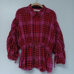 SOLD!--We The Free Pacific Dawn Pink Red Plaid Ruched Sleeve Shirt, Wool/ Small