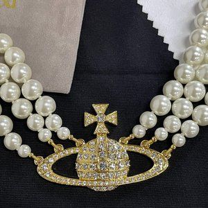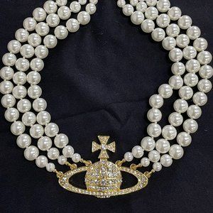 💯Vivienne Westwood Three Row Pearl bas relief Choker Necklace