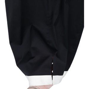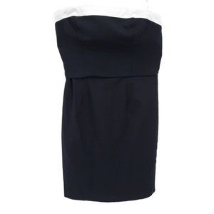 This little black dress is complete with a white silk panel across the strapless neckline, a flattering sheath silhouette, and another white silk panel across the mini length hemline.