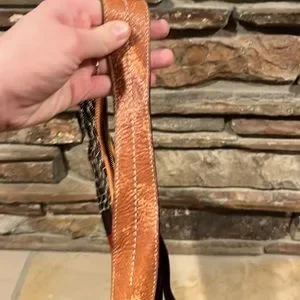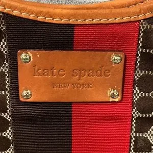 Very cute graphic print with red and brown stripes. Features a removable crossbody strap, so it can be worn multiple ways. There is some tarnishing to the hardware on the front logo, discoloration to the leather, and bending to the leather straps (see photos). In clean condition and otherwise gently used. Measures approximately 15” across and 15.5” from where the strap begins to the bottom of the bag.