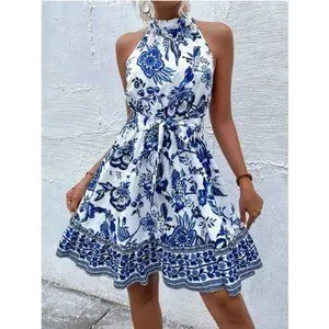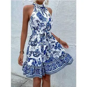 Blue And White Boho Women's Floral Print Belted Halter Dress Vacation Beach
