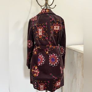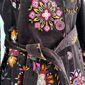 Corduroy trench in brown with multi colored print-bright pinks, yellow and green. Pockets; belted; large buttons; not lined; size 4