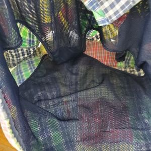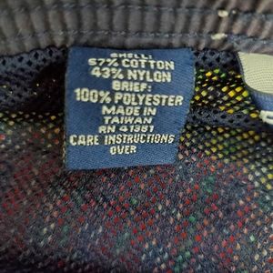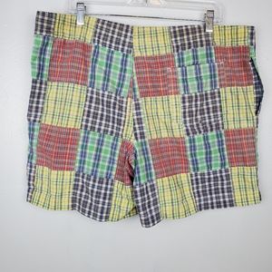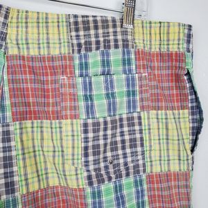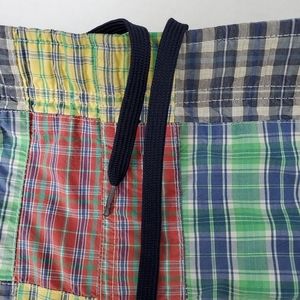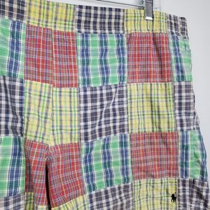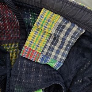 Amazing vintage Ralph Lauren Polo Sport patchwork swim shorts. Blue embroidered logo pony on bottom front. Colors of green, yellow, red, blue and white plaid patchwork. Elastic waist with drawstring. Mesh brief lining. Hidden pocket on inside.