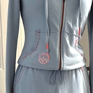 This is an adorable set of longe wear zip up jacket and pants. Pants have elastic& drawstring closure for a snug and comfortable fit. The jacket is embellished with peace sign and fabric appliqués and paint transfers. It is in really good condition! Pant size large but could fit med-large, measurements flat-waist 14.5, inseam 33”.